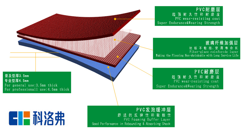 一. 運動地板由TPU處理的表層、PVC耐磨層、1000D的玻璃纖維補強網和特殊網格布纖維加強層和PVC發泡緩沖層組成。