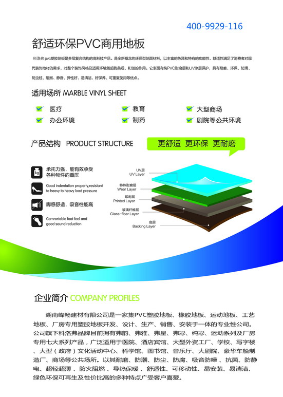 PVC地板是一種以半硬質聚氯乙稀,PVC樹脂和天然石粉為主料,在高溫高壓條件下,經過特殊生產工藝制成的綠色環保的新型輕體地面材料。產品紋路逼真美觀、超強耐磨,表面光亮而不滑,環保無毒、耐磨、耐刮擦,還能防滑、防水、防火等優點。現在世界上各大醫院,幼兒園都以此種材料作為地面裝飾首選材料。
