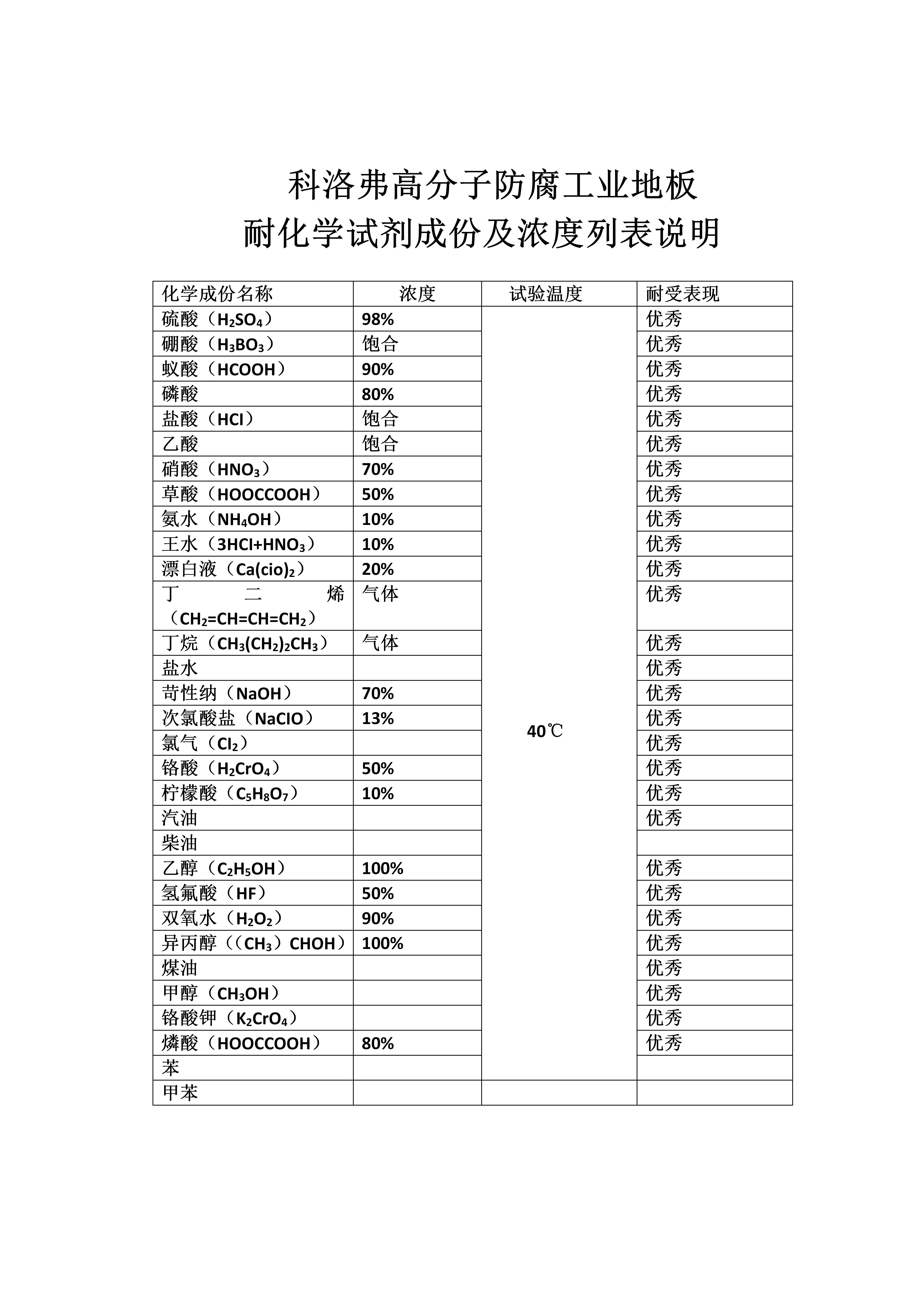 科洛弗高分子防腐工業(yè)地板可耐受的各種化學(xué)試劑