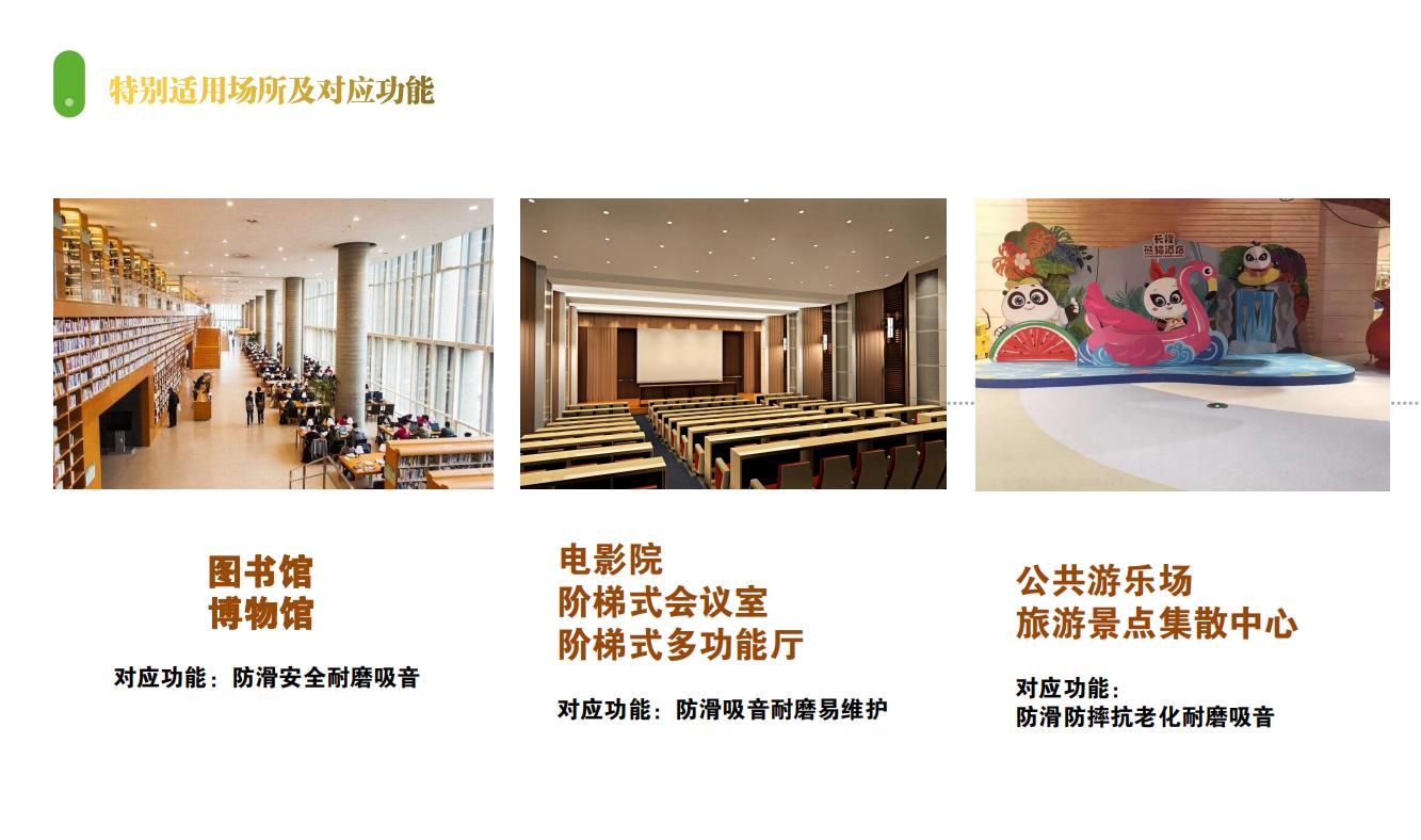 特別適用特點:3.7mm實心高彈力納米材料有著超強靜音性能,可營造高度安靜的行走環境;高回彈性保證了地面的高舒適性,可大幅減少因行少而產生的勞累。超耐磨性保證地面的超長使用壽命,避免地面頻繁維修更換。