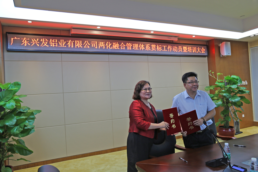 與會人員包括廣東省清潔生產協會會長及各技術工程師,興發高層領導及各職能部門負責人。會議期間,就推進兩化融合管理體系的貫標工作,公司特成立貫標領導小組和工作小組,明確各小組成員及工作職責,興發董事長劉立斌與協會會長黃建平簽署責任狀,旨在通過雙方通力合作完成兩化融合管理體系貫標評定工作。